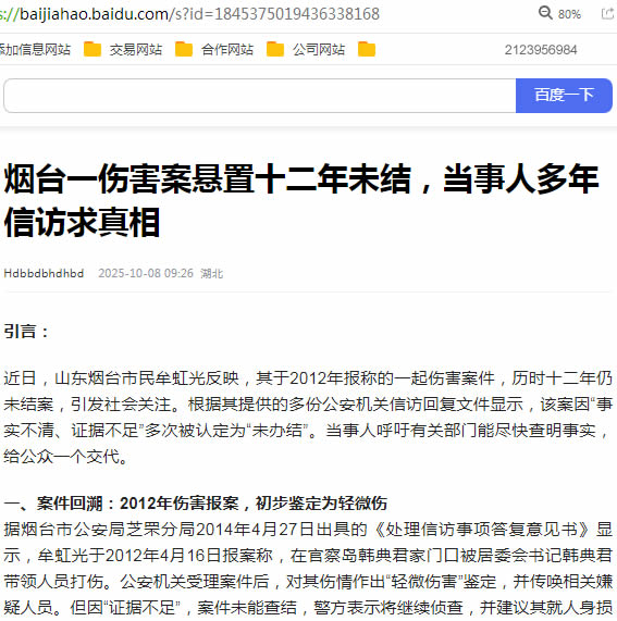 近日,山东烟台市民牟虹光反映,其于2012年报称的一起伤害案件,历时十二年仍未结案,引发社会关注。根据其提供的多份某机关信访回复文件显示,该案因“事实不清、证据不足”多次被认定为“未办结”。当事人呼吁有关部门能尽快查明事实,给公众一个交代。