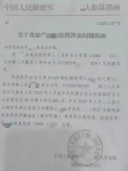其行为影响极其恶劣并涉嫌破坏军婚,请求依法立案侦查,依法办理。这份盖有部队公章的函件,足以证明部队对于此事的重视和定性。