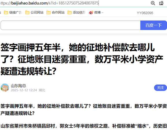 据当事人叙述,一份签了五年半的征地补偿协议,对山东莱州朱桥镇昌邱村村民郭女士(化名)一家来说,至今仍是一张未能兑现的“白条”。同村其他村民的补偿款陆续到账,她家的14.6万元(按已知标准计算)却始终不见踪影。长达五年的追索,不仅未能要回自家应得的款项,反而牵出了一连串令人费解的问题:官方白纸黑字的补偿标准为何在实际中“打了折”?二十多年前的旧账补偿是否成了“空头支票”?更惊人的是,一份官方审计数据对比显示,该村整体征地补偿账目存在触目惊心的“账实不符”,上百万元补偿资金“蒸发”,十多亩土地面积“失踪”。与此同时,村集体一处近八千平方米的小学资产,被以十万元的价格“打包”转让,其程序合规性也疑点重重。这究竟是怎么回事?