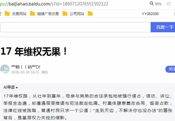 一块承包地,维权 17 年,我从壮年走到暮年,付出了无数时间和精力,换来的却是层层推诿、恶意侵权和一纸让人难以信服的裁定。基层本应是守护百姓合法权益的第一道防线,可在这里,我的承包权被肆意侵犯,财产被损毁,赔偿被私分;司法本应是维护公平正义的最后一道屏障,可却对明显的合同违法问题避而不谈,让我有理无处说,有冤无处申。