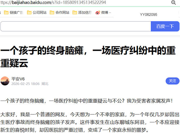 大家好,我是一个普通的网友,今天想为一个不幸的家庭,为一个年仅几岁却因出生医疗事故而终身脑瘫的孩子发声。这件事发生在山东聊城东阿县,一个本应迎接新生的喜悦时刻,却因医院的严重过错,变成了一个家庭永恒的噩梦。