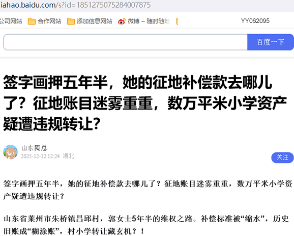 据当事人叙述,一份签了五年半的征地补偿协议,对山东莱州朱桥镇昌邱村村民郭女士(化名)一家来说,至今仍是一张未能兑现的“白条”。同村其他村民的补偿款陆续到账,她家的14.6万元(按已知标准计算)却始终不见踪影。长达五年的追索,不仅未能要回自家应得的款项,反而牵出了一连串令人费解的问题:官方白纸黑字的补偿标准为何在实际中“打了折”?二十多年前的旧账补偿是否成了“空头支票”?更惊人的是,一份官方审计数据对比显示,该村整体征地补偿账目存在触目惊心的“账实不符”,上百万元补偿资金“蒸发”,十多亩土地面积“失踪”。与此同时,村集体一处近八千平方米的小学资产,被以十万元的价格“打包”转让,其程序合规性也疑点重重。这究竟是怎么回事?